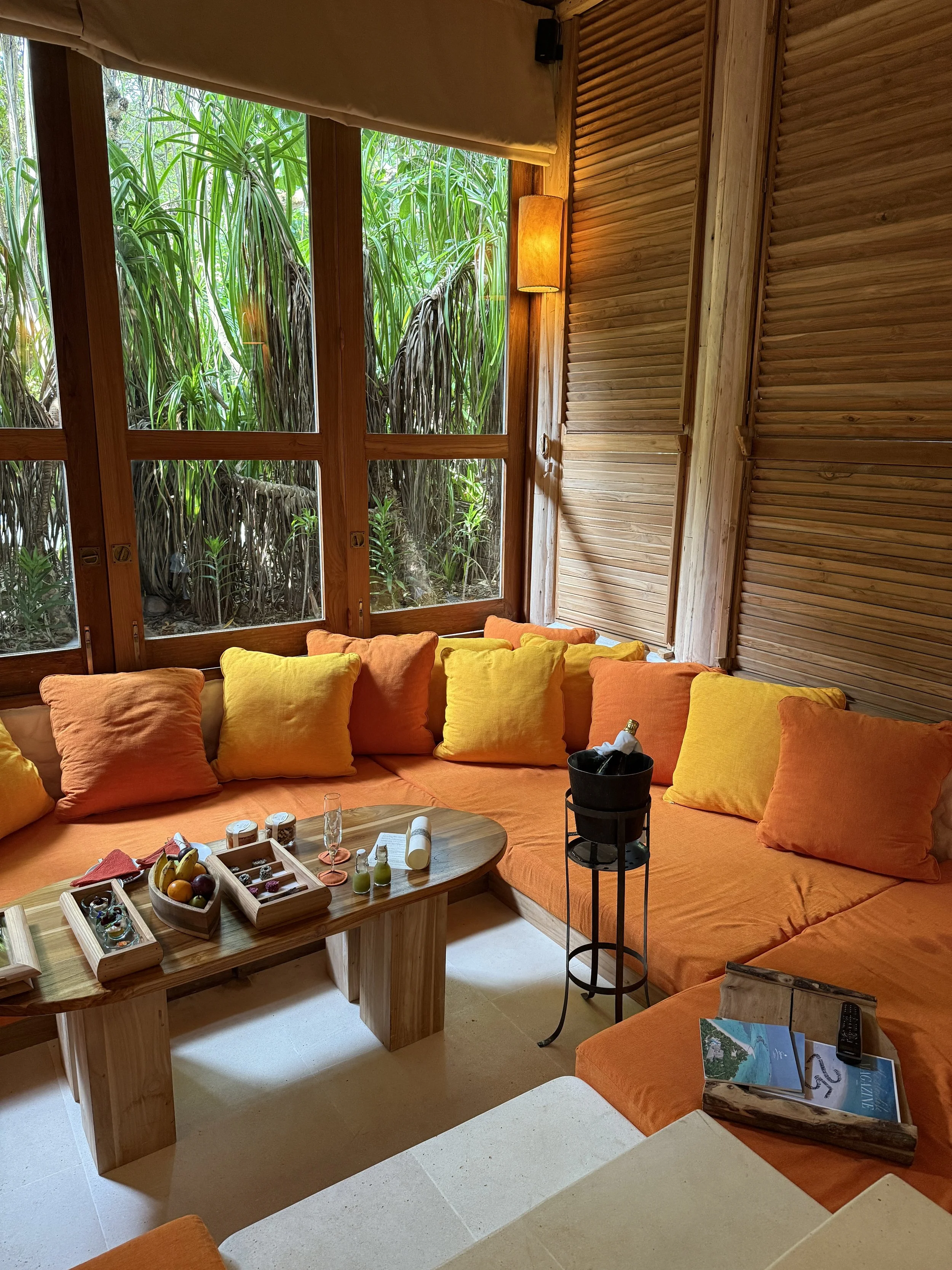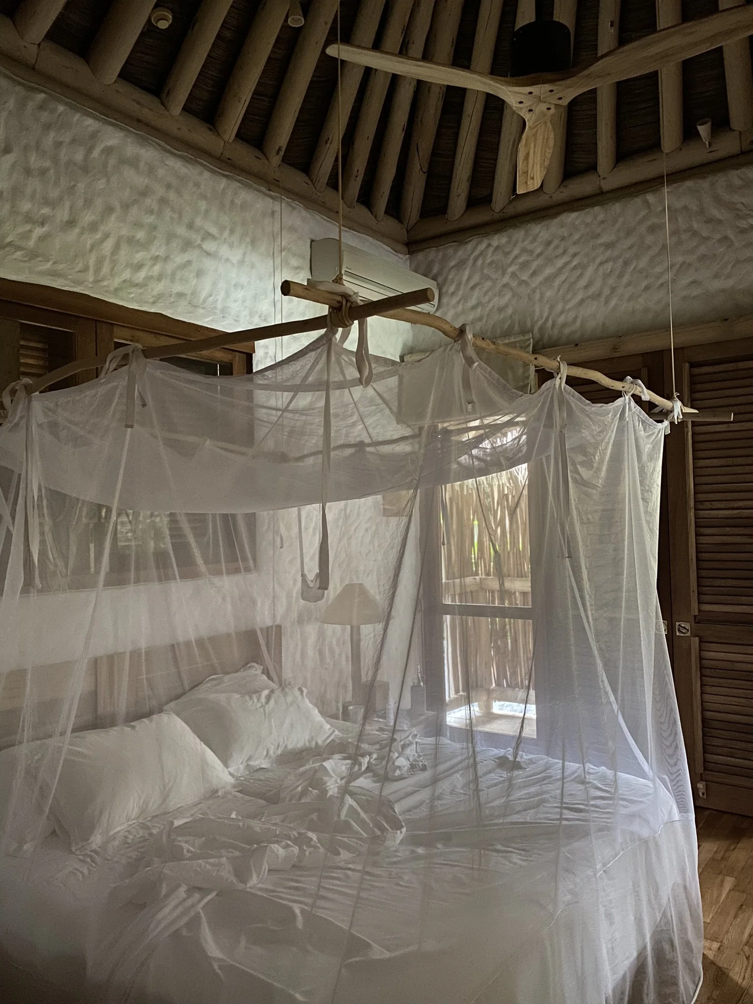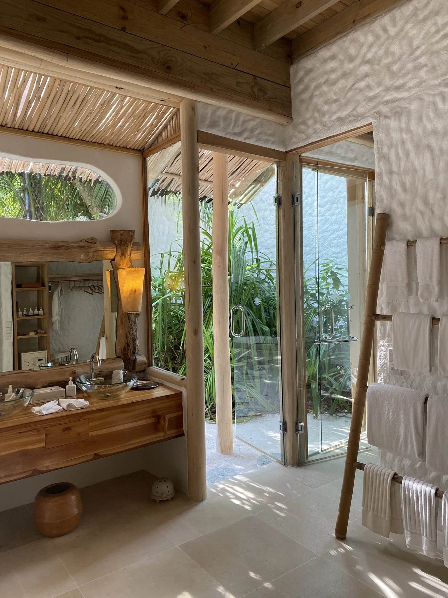 The bathroom was an unexpected delight: a vast, open space with a bathtub that overlooks the lush greenery—a perfect spot for stargazing in total privacy. The sustainable, coral-friendly skincare products were a thoughtful touch, and I appreciated the extra amenities like SPF lotion and aloe vera gel, ready to refresh after a day in the sun.